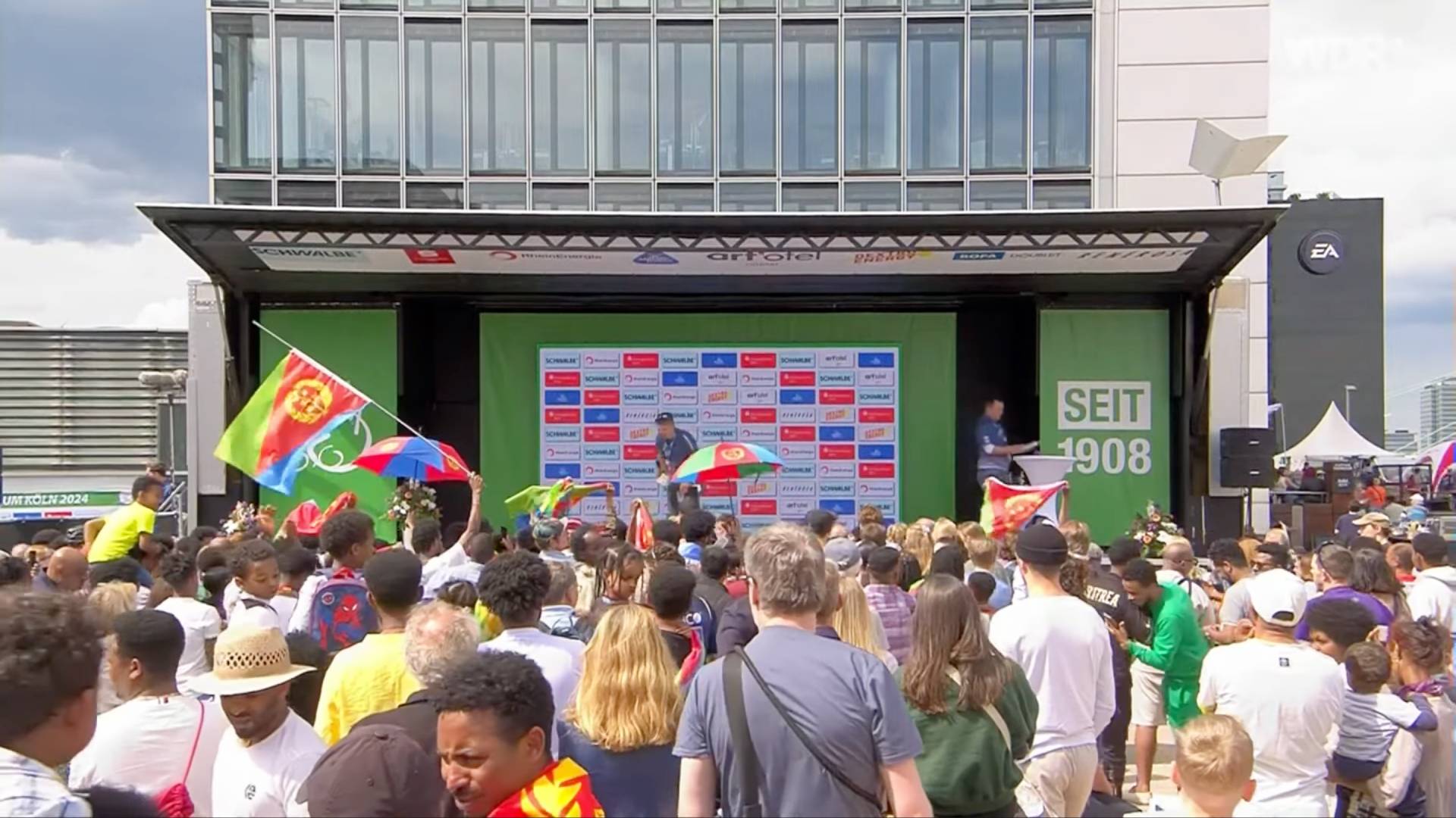 Op de "Harry Blum Platz" stond ook een podiumtrailer van EuroTech met een losse PA installatie van ons, bestaande uit 4x (2 op elkaar) BOSE 802's op 2 windups, met twee draadloze microfoons en de mogelijkheid voor de organisatie om met een iPhone eigen tunes af te draaien tijdens de presentatie en ook de huldiging. Wij stonden zelf op 100m afstand in de start-/finish straat, met technische ondersteuning op afstand. Het was gigantisch druk op het 'media-plein' en dan komen de dubbele 802's op statief wel erg van pas.